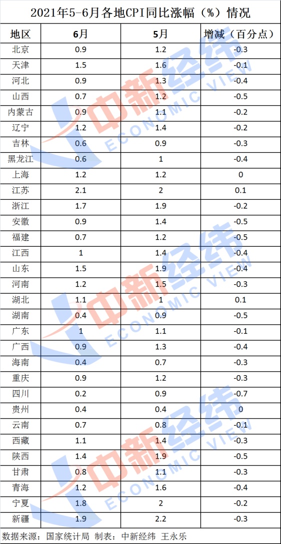 国家统计局日前公布了31省份2021年6月居民消费价格指数(CPI),数据显示,27省份6月CPI同比涨幅回落,四川降幅最大为0.7个百分点。