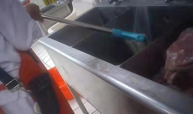 “这个戴着口罩都能闻到臭味儿,一会儿拿去铰馅。”6月23日,两名员工在操作台上分拣隔夜肉,她们将臭味明显的,直接丢到一旁,简单冲洗后倒进铰肉机。一名女工边铰肉边说:“我这肉馅是酸的。”