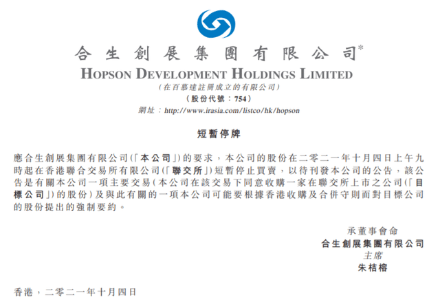 与此同时,合生创展也在公告中宣布短暂停止买卖,以待刊发一份关于其主要交易的公告,“本公司在该交易下同意收购一家在联交所上市之公司的股份”。