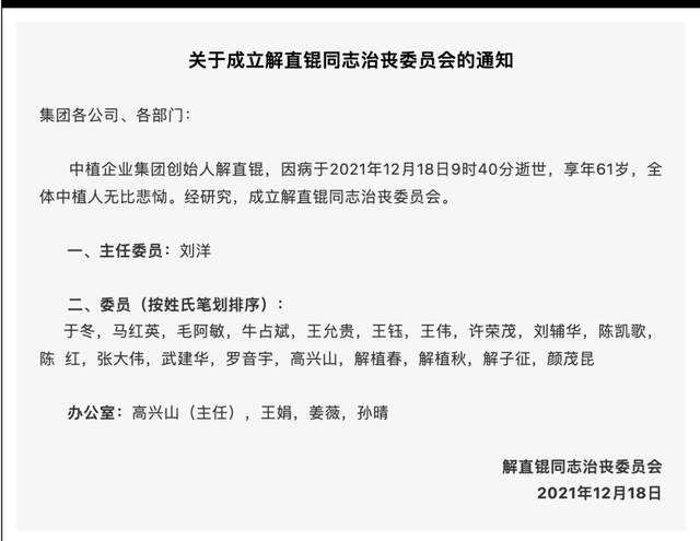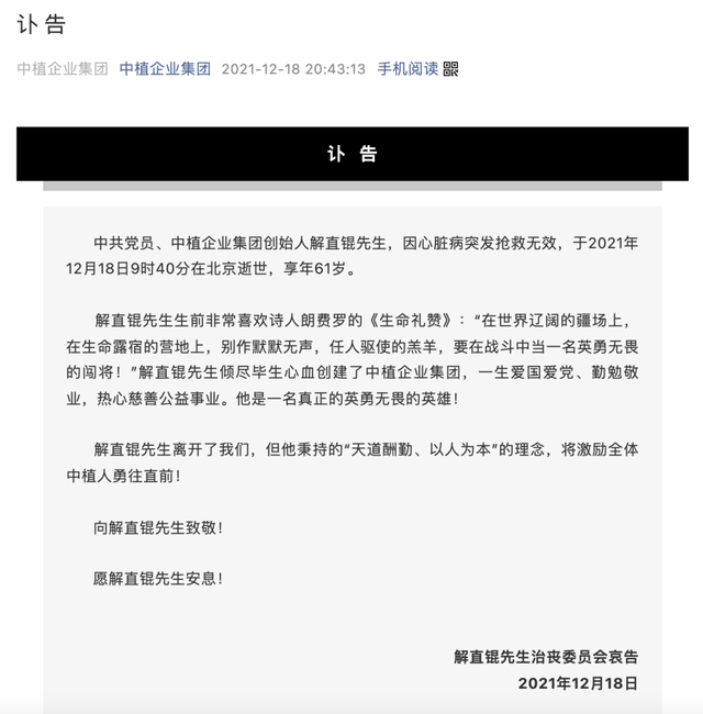 12月18日晚20时,中植企业集团官方微信发布讣告:中植企业集团创始人解直锟先生,因心脏病突发抢救无效,于18日9时在北京逝世,享年61岁。