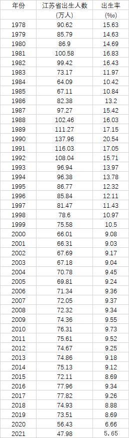 表:1978年以来江苏历年出生人口数据(数据来源:第一财经记者根据《江苏统计年鉴2021》、2021年江苏省国民经济和社会发展统计公报整理)