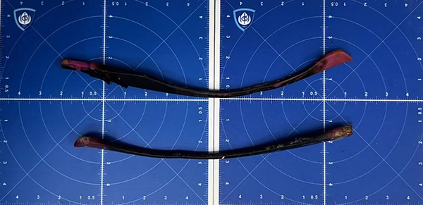 中山医院周平红教授团队在内镜下取物手术非常顺利,滴血未出,病人清醒后没有任何腹痛、腹胀不适,仅仅耗时15分钟就完成了2个眼镜腿的取出工作。