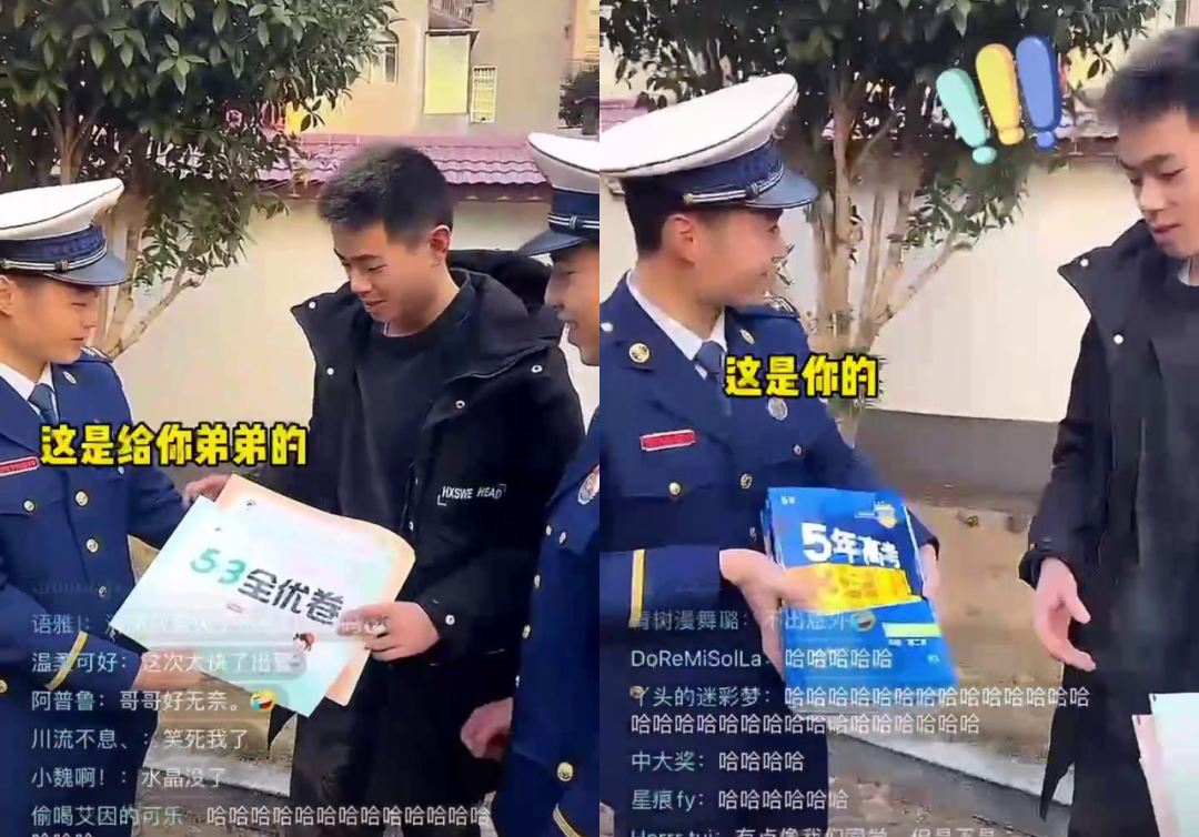 同时,消防队还赠送了兄弟俩一人一堆试卷。
