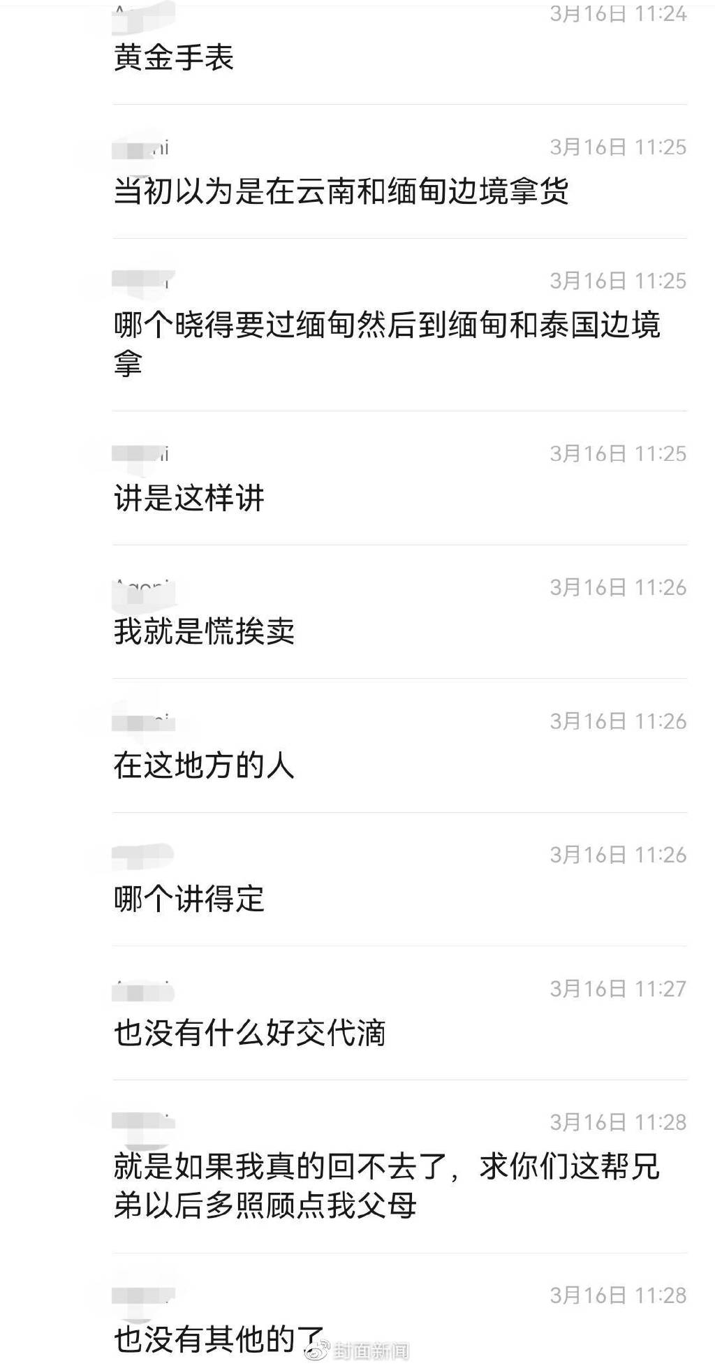 3月16日11:19,小唐告诉朋友:不知道回不回得去,交代后事;做走私,黄金手表,当初以为在云南和缅甸边境拿货,哪个晓得要过缅甸,到缅甸和泰国边境拿。如果我真回不去了,求你们这帮兄弟以后多照顾点我父母。