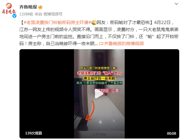4月22日,江苏一网友上传的视频令人哭笑不得。画面显示,凌晨时分,一只大老鼠鬼鬼祟祟地闯进一户房主门前的监控。直接沿门而上,不仅按了门铃,还“输”起了开锁密码!房主称,自己当晚被吓得一夜未眠……