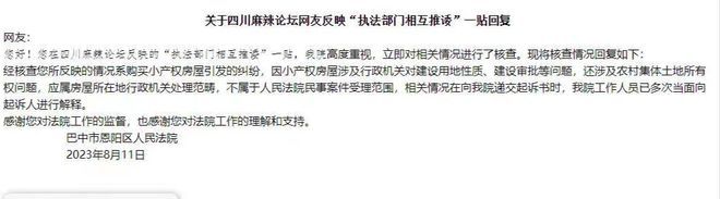 针对余小姐的发帖,巴中市恩阳区人民法院回复:“经核查您所反映的情况系购买小产权房屋引发的纠纷,因小产权房涉及行政机关对建设用地性质、建设审批等问题,还涉及农村集体土地所有权问题,应属房屋所在地行政机关处理范畴,不属于人民法院民事案件受理范围,相关情况在向我院递交起诉书时,我院工作人员多次当面向起诉人进行解释。”
