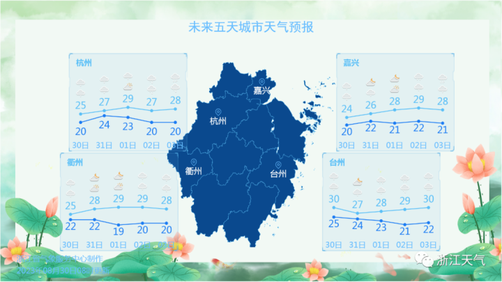 明天早晨最低温度:浙南和沿海地区:23-25度;其它地区:20-22度。