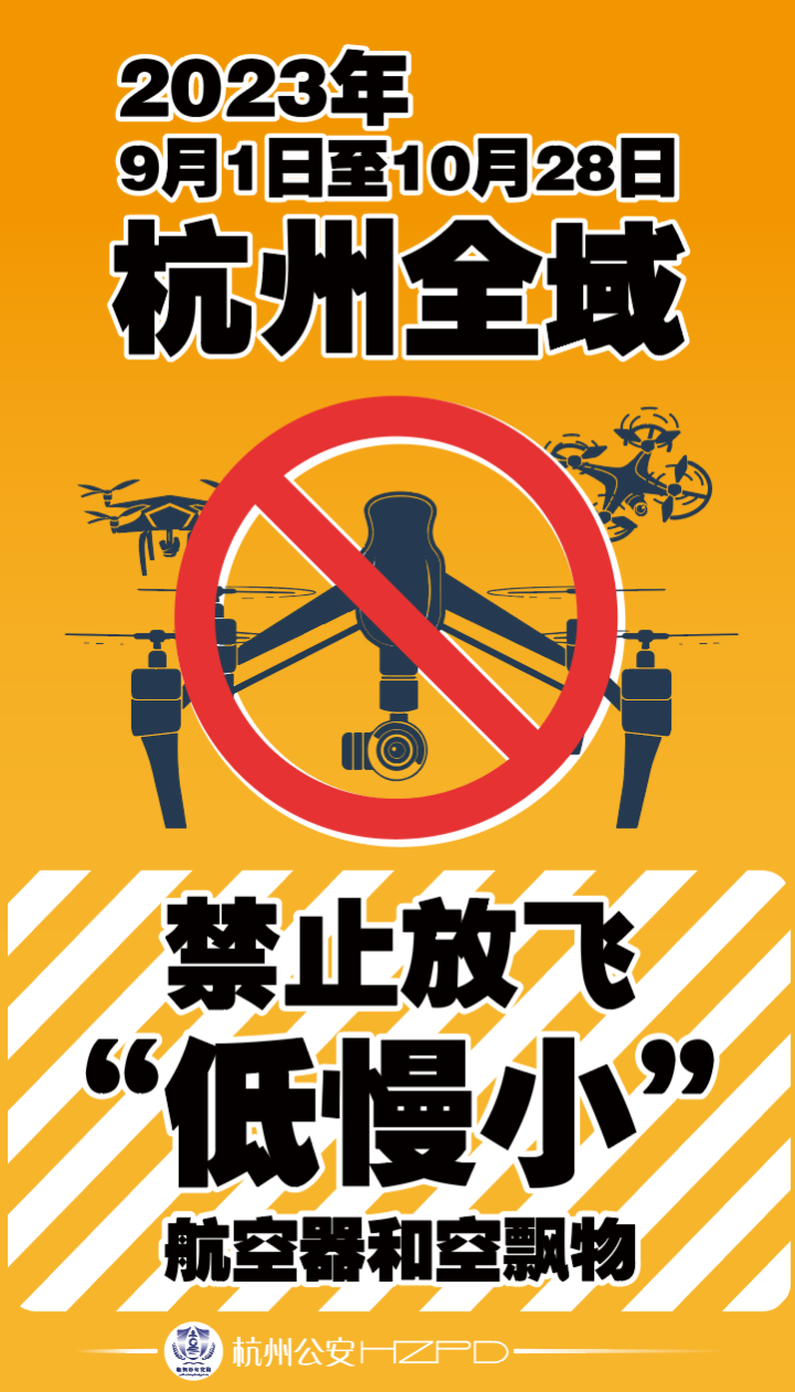 请广大市民群众严格遵守《杭州市人民政府关于第19届亚运会和第4届亚残运会筹备举办期间对“低慢小”航空器及空飘物实施临时管控的通告》,做到在规定时段(2023年9月1日0时至10月28日24时)在杭州市行政区域全境不施放无人机等“低慢小”航空器及空飘物。