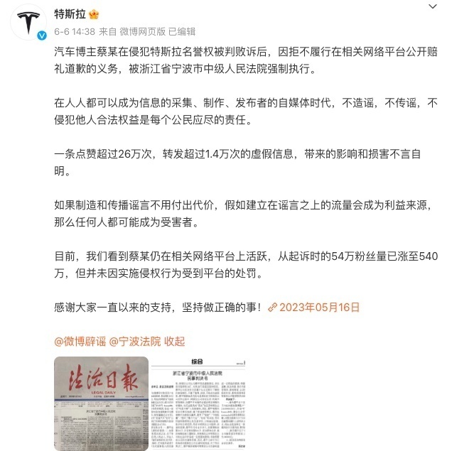2022年,宁波中级人民法院判决结果显示,法院认定“蔡老板”视频内容并无事实依据,属于捏造虚假事实。“蔡老板”应向特斯拉赔礼道歉,并赔偿特斯拉侵权损失10万元。今年6月6日,特斯拉官方微博发文称,全网粉丝近700万的汽车博主蔡某因拒不履行公开赔礼道歉义务,被宁波市中院强制执行。