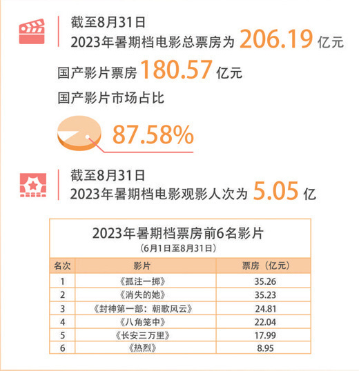 2023年中国电影暑期档创造多项新纪录。截至8月31日,该档期总票房为206.19亿元,创下暑期档票房历史新高;观影人次为5.05亿,创下历年暑期档观影人次新高。今年暑期档共上映约140部影片,供给丰富,呈现多样化、多品种、多类型的态势,观众几乎每周都有新选择,不同群体都有适合其审美的影片。虽有多部进口影片参与市场竞争,但国产电影领跑优势明显,市场占比为87.58%,说明观众对国产电影的信任度、满意度在增加。这个暑期档,《消失的她》《孤注一掷》两部影片票房均超过35亿元,《封神第一部:朝歌风云》《八角笼中》两部电影票房均超过20亿元,《长安三万里》票房近18亿元,《热烈》《我爱你!》等10余部影片票房超过亿元。由此可以看出,中国电影的市场结构更趋合理,可持续发展的基础更加厚实。
