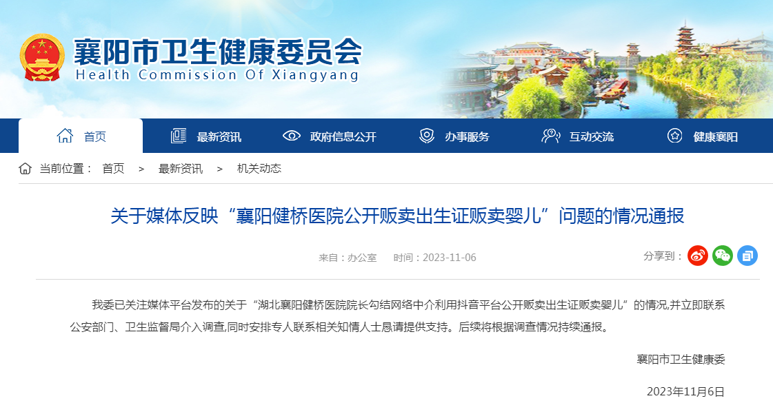 我委已关注媒体平台发布的关于“湖北襄阳健桥医院院长勾结网络中介利用抖音平台公开贩卖出生证贩卖婴儿”的情况,并立即联系公安部门、卫生监督局介入调查,同时安排专人联系相关知情人士恳请提供支持。后续将根据调查情况持续通报。