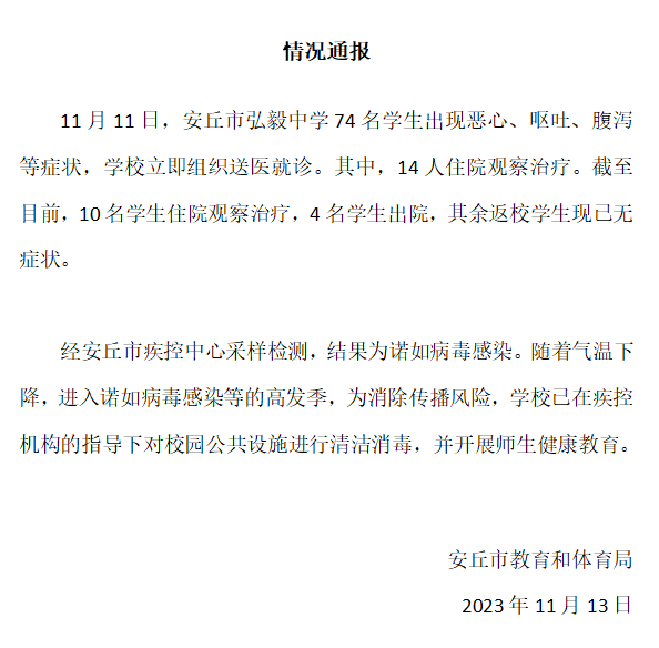山东安丘通报“74名中学生恶心呕吐”:系诺如病毒感染
