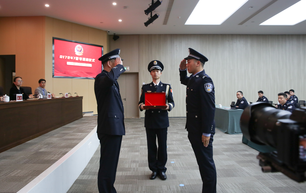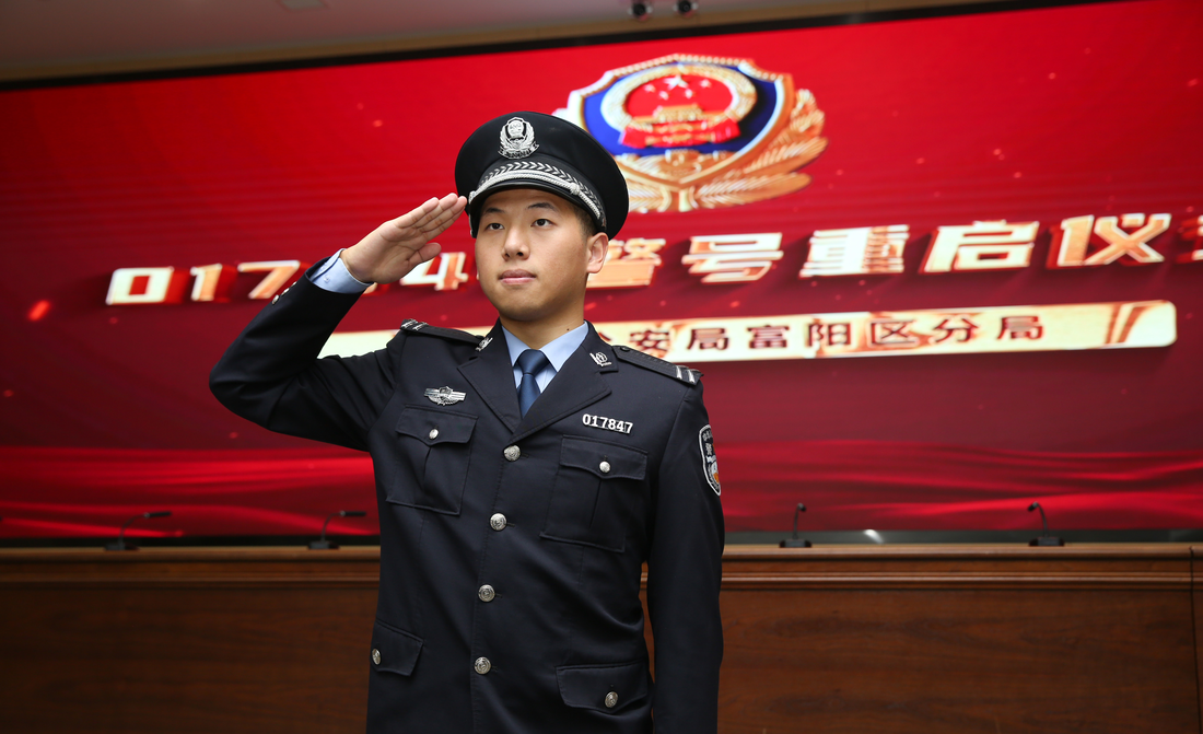 富阳区副区长、公安局长沈尧为金晨昊佩戴重启的警号。