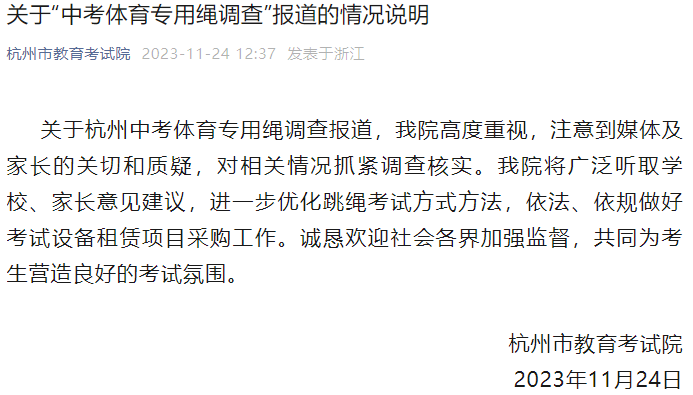 杭州市教育考试院11月24日发布《关于“中考体育专用绳调查”报道的情况说明》:
