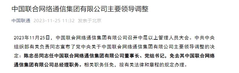 2023年11月25日,中国联合网络通信集团有限公司召开中层以上管理人员大会。中共中央组织部有关负责同志宣布了党中央关于中国联合网络通信集团有限公司主要领导调整的决定:陈忠岳同志任中国联合网络通信集团有限公司董事长、党组书记,免去其中国联合网络通信集团有限公司总经理职务。相关职务任免,按有关法律和章程的规定办理。