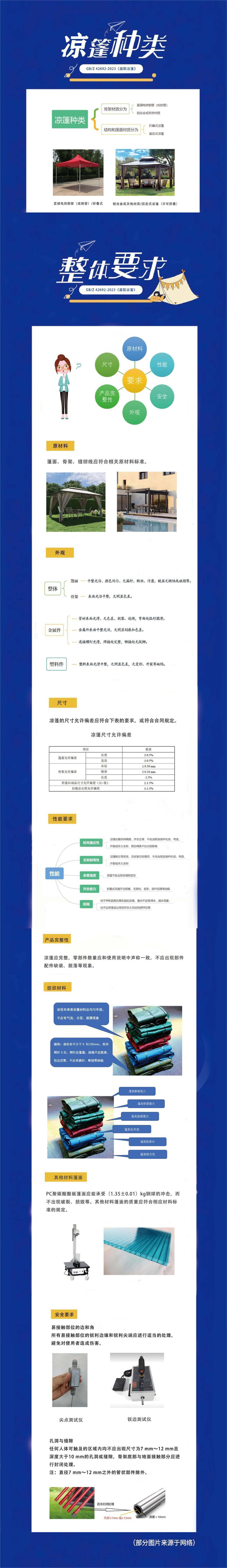 文件首次对庭院凉篷从产品分类、原材料、外观、产品完整性、尺寸、性能要求和安全要求等方面进行详细规范。