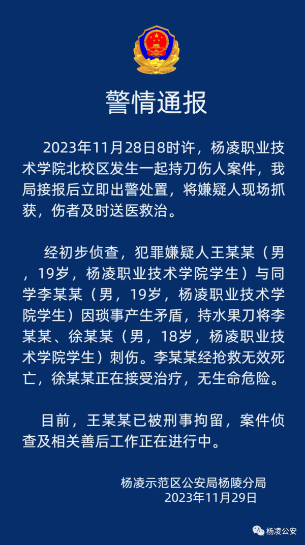 陕西杨凌示范区公安局杨陵分局11月29日发布《警情通报》: