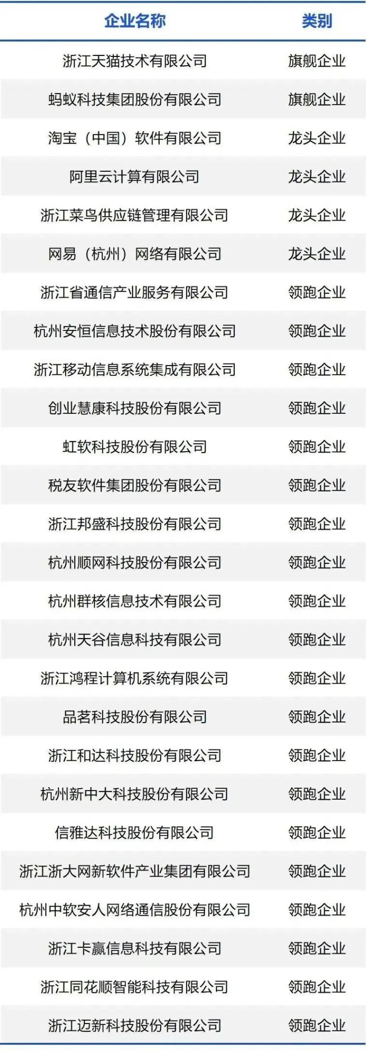 其中,浙江天猫技术有限公司、蚂蚁科技集团股份有限公司入选服务业旗舰企业;淘宝(中国)软件有限公司、阿里云计算有限公司、浙江菜鸟供应链管理有限公司、网易(杭州)网络有限公司入选服务业龙头企业;浙江省通信产业服务有限公司、杭州安恒信息技术股份有限公司等20家软件与信息服务业企业入选服务业领跑企业。