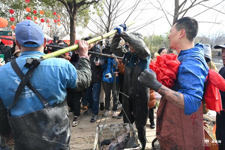 一时间,塘内群鱼欢腾,岸上喝彩阵阵,热闹无比。在一阵欢呼中,貌似“鱼王”出水亮相,为西溪干塘节带来好彩头。