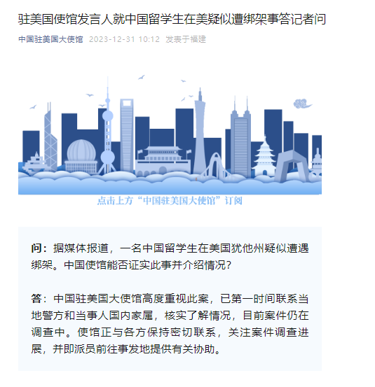 答:中国驻美国大使馆高度重视此案,已第一时间联系当地警方和当事人国内家属,核实了解情况,目前案件仍在调查中。使馆正与各方保持密切联系,关注案件调查进展,并即派员前往事发地提供有关协助。