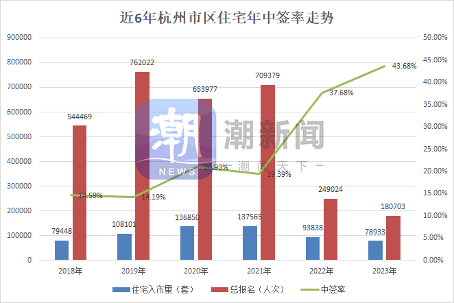 市场低迷直接反映在中签率上,2023年杭州市区(含富阳、临安)整体楼盘中签率为43.68%,较去年又升高了,全年报名人数仅为180703,也是2018年购买热情最低的一次。