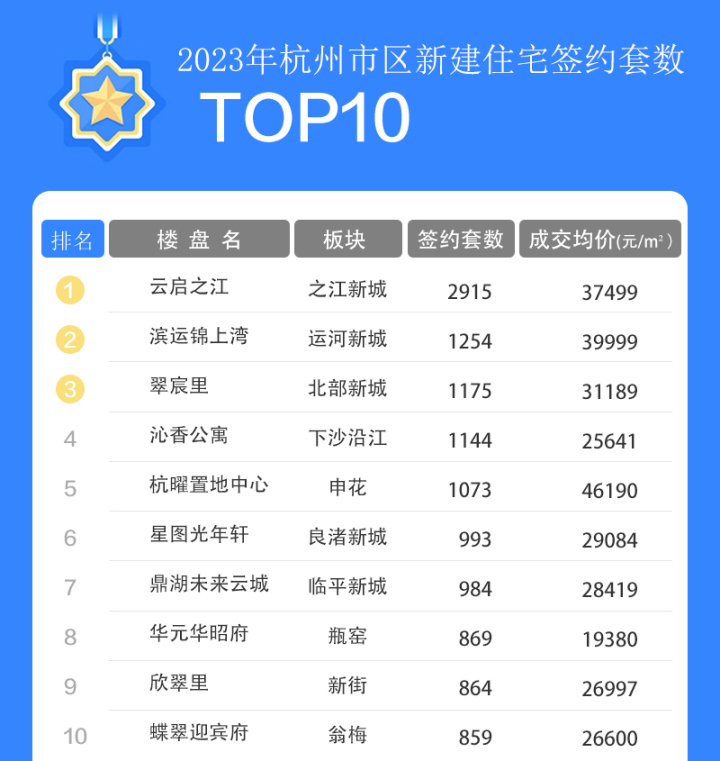 虽然新房市场低迷,不过单盘的销售力还是让人眼前一亮。特别是2023年单盘销售唯一一个突破百亿元的楼盘——云启之江,最终签约数据可能在180亿元,而4个月卖出3070套房源,在杭州也算是独一档。其余成交千套以上的楼盘也是百花齐放,它们分别位于运河新城、北部新城、下沙沿江、申花板块,从中我们也能看出更多板块被大众所接受。