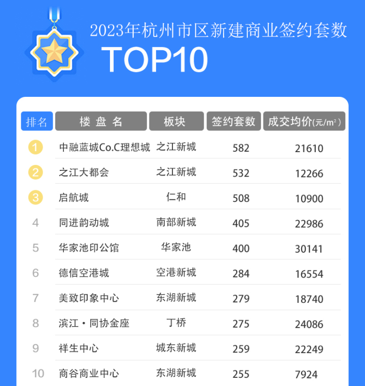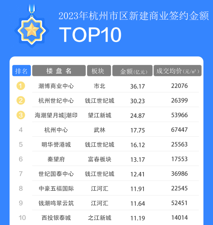 另外,在非住宅方面,之江新城的中融蓝城Co.C理想城和之江大都会,成交套数分列前两位;而市北的潮博商业中心以36.17亿元成交排名额第一,而这个金额连住宅销售排名前十都进不了。
