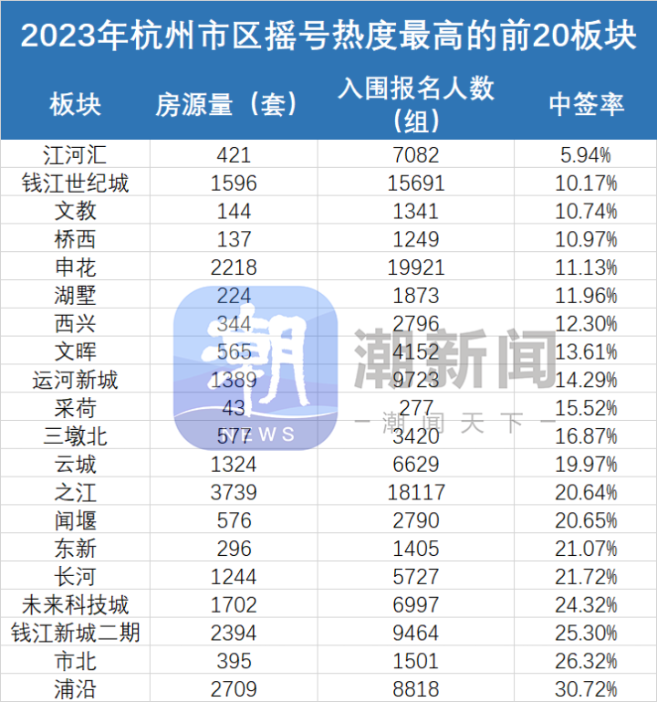 从板块中签来看,2023年热度最高的前十板块分别是江河汇、钱江世纪城、文教、桥西、申花、湖墅、西兴、文晖、运河新城、采荷,其中江河汇是唯一一个中签率低于10%的板块。