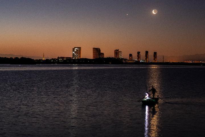 由于金星总在太阳附近徘徊,所以月球与之相伴时,月相要么是农历月初的蛾眉月,窄窄的;要么是农历月末的残月,细细的。