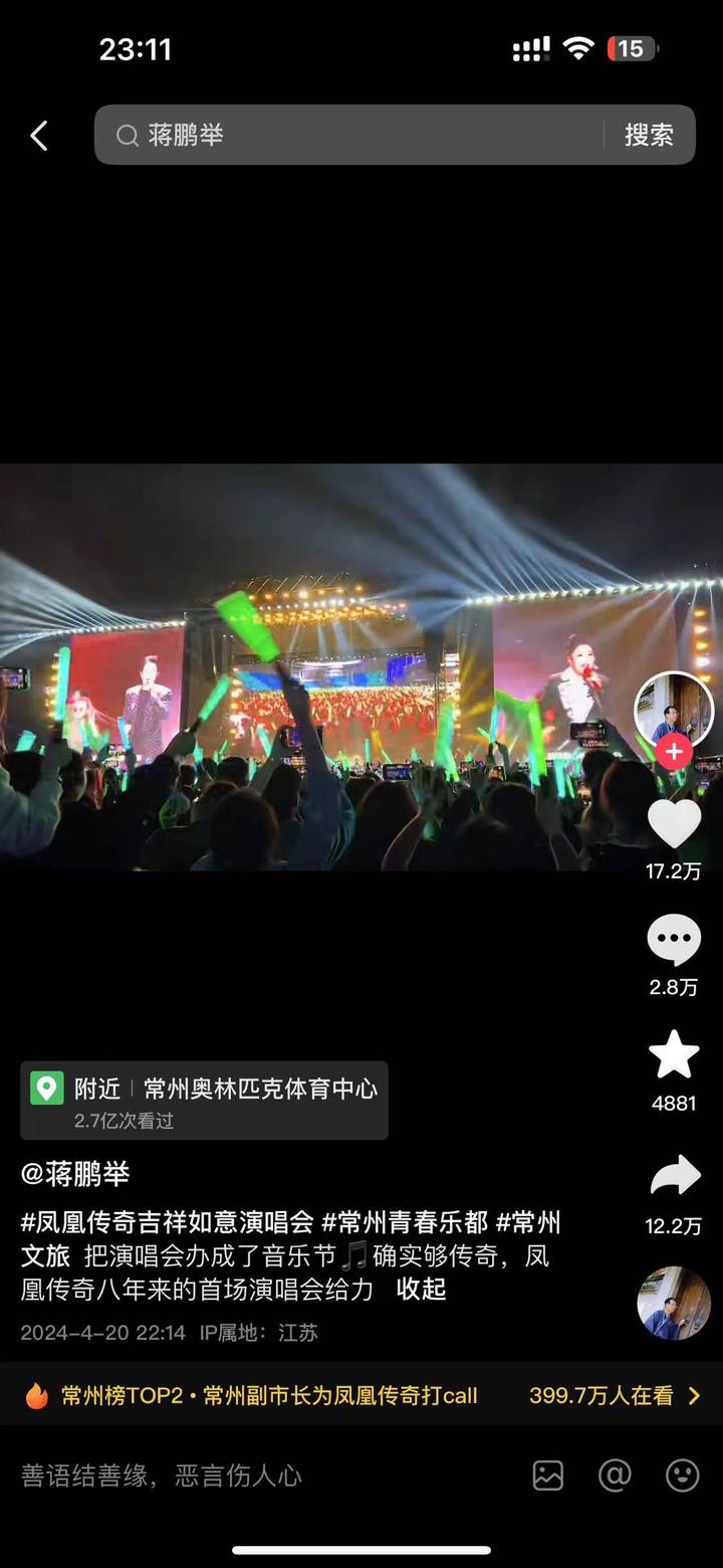 这两天有不少网友都在社交媒体平台刷到一条由蒋鹏举发布的凤凰传奇常州演唱会的现场视频。“把演唱会办成了音乐节,确实够传奇,凤凰传奇八年来的首场演唱会给力。”
